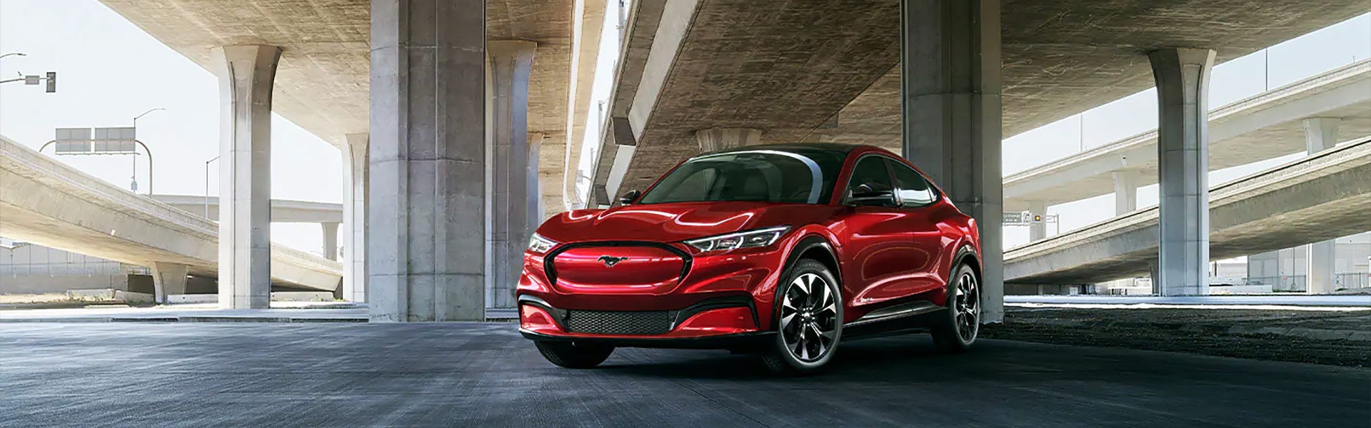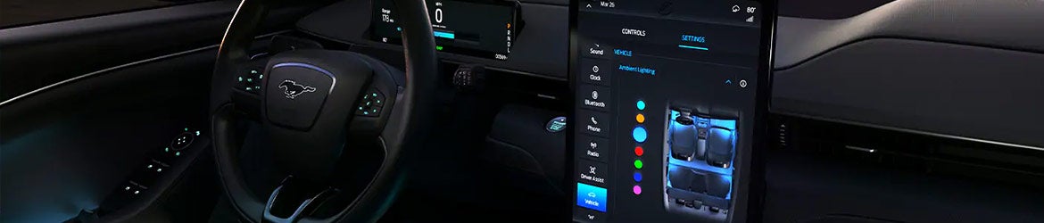 Every Mach-E features a rotary gear shift dial, intelligent access, and push-button start. Available features include customizable ambient lighting, a heated steering wheel, heated front seats, and a panoramic sunroof.