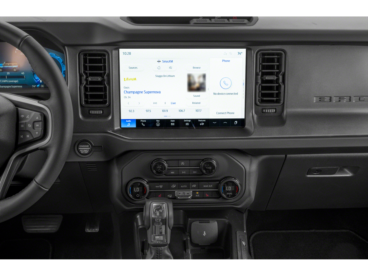 4-Wheel Disc Brakes, 4.46 Axle Ratio, 7 Speakers, ABS brakes, Air Conditioning, Alloy wheels, AM/FM radio: SiriusXM with 360L, AM/FM Stereo, Auto High-beam Headlights, Brake assist, Cloth Bucket Seats, Compass, Connected Navigation, Delay-off headlights, Driver door bin, Driver vanity mirror, Dual front impact airbags, Dual front side impact airbags, Electronic Stability Control, Emergency communication system: 911 Assist, Exterior Parking Camera Rear, Front anti-roll bar, Front Bucket Seats, Front Center Armrest, Front reading lights, Front wheel independent suspension, Fully automatic headlights, Heated door mirrors, Illuminated entry, Integrated roll-over protection, Leather Shift Knob, Low tire pressure warning, Occupant sensing airbag, Outside temperature display, Overhead airbag, Overhead console, Panic alarm, Passenger door bin, Passenger vanity mirror, Power door mirrors, Power steering, Power windows, Radio data system, Remote keyless entry, Security system, SiriusXM w/360L, Speed control, Split folding rear seat, Steering wheel mounted audio controls, SYNC 4, Tachometer, Telescoping steering wheel, Tilt steering wheel, Traction control, Trip computer, Variably intermittent wipers, and Wheels: 17 Carbonized Gray-Painted Aluminum.
